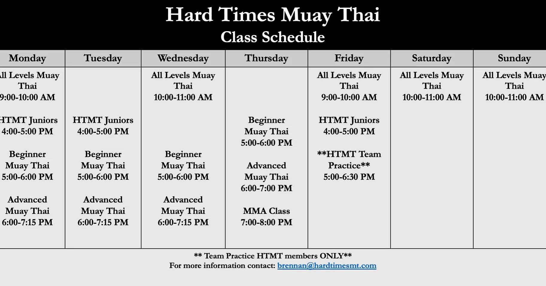 Beginner/All Levels Muay Thai: provides an introduction to foundational concepts and techniques involved in the art of Muay Thai. Class includes pad work, partner work, bag work, and light drilling. No sparring.